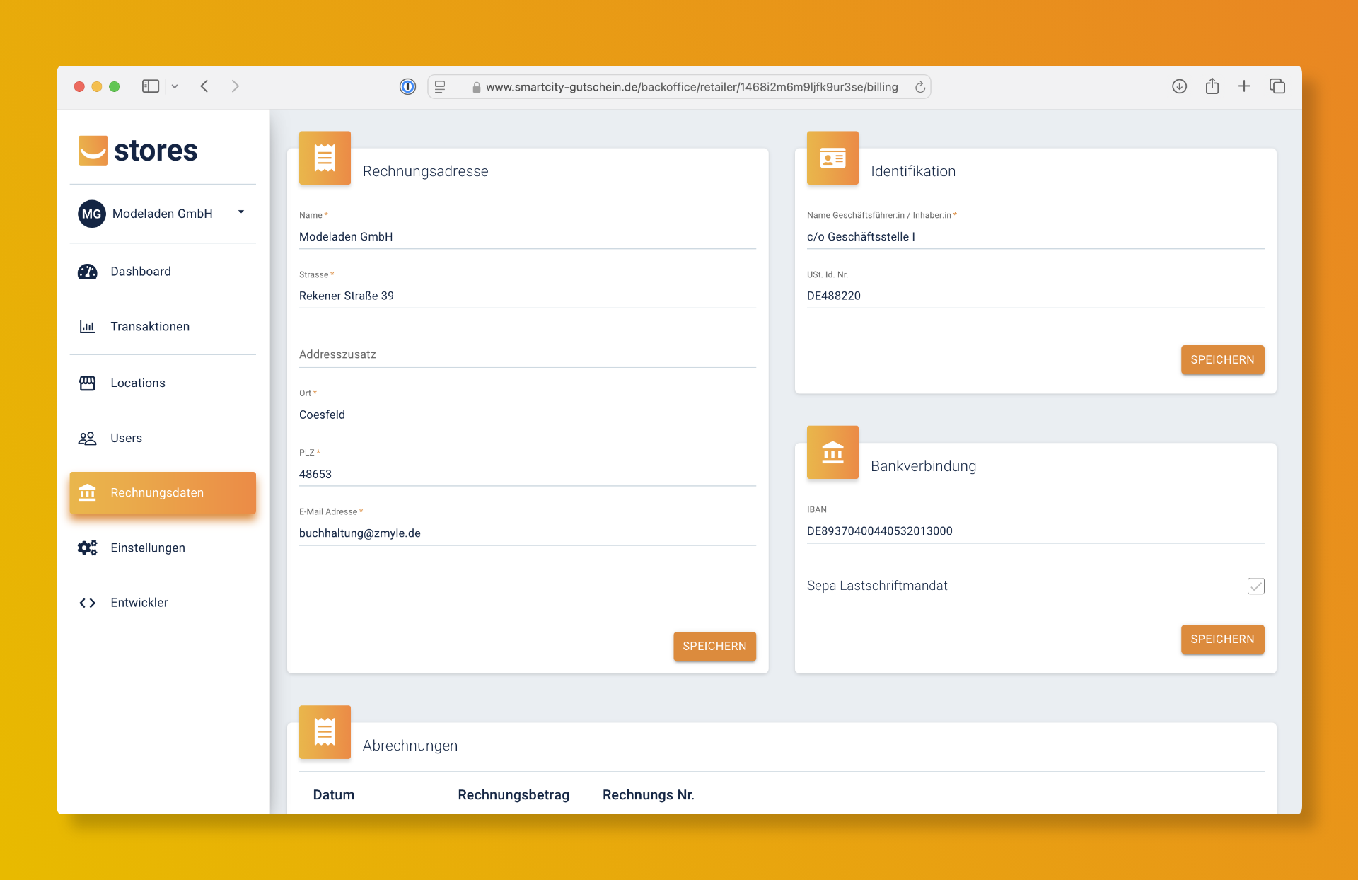 <figure><img src="https://2048260169-files.gitbook.io/~/files/v0/b/gitbook-x-prod.appspot.com/o/spaces%2FF7U401jgjBhDWT6xN8Lv%2Fuploads%2FJRdYWWwPtHgOQhd05jZd%2Fstores%20%E2%80%93%20rechnungsdaten.png?alt=media&#x26;token=d71cfd1a-4568-418d-844b-016425db973e" alt=""><figcaption></figcaption></figure>