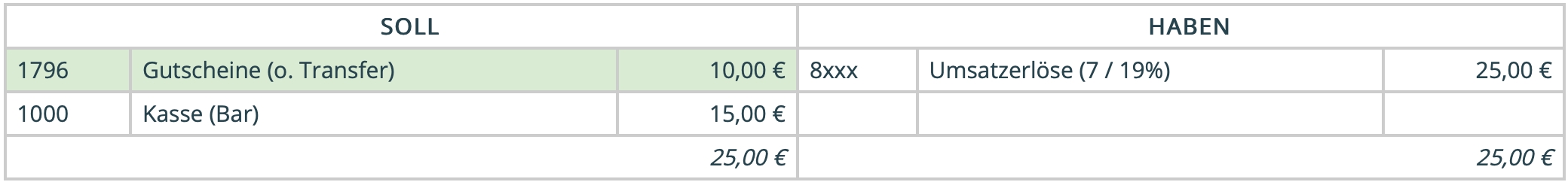 Der beschenkte Kunde betritt Euer Geschäft und kauft Waren in Höhe von 25 EUR. 10 EUR möchte er mit dem Gutschein bezahlen und die Differenz gleicht er in Bar aus.